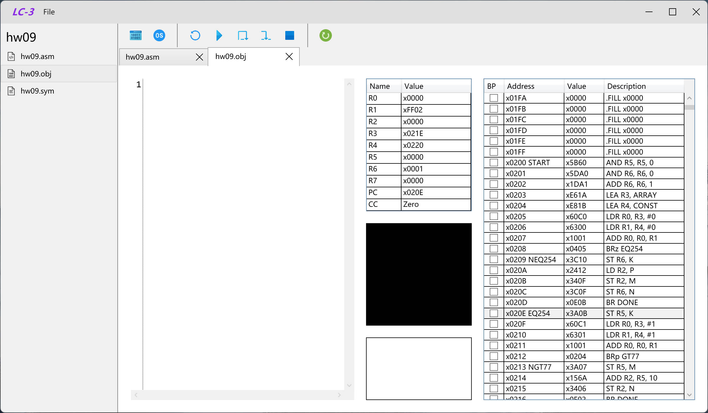 - Clear State Views: Dedicated panels for the Program Counter (PC), Registers (R0–R7), condition codes (N/Z/P), and Memory. You can watch these values update in real-time with every step.